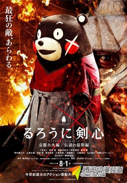 根据和月伸宏漫画原作改编的真人电影《浪客剑心 京都大火篇/传说末日篇》在官网上曝光了一张熊本县的吉祥物“熊本熊”出演主人公绯村剑心的海报。