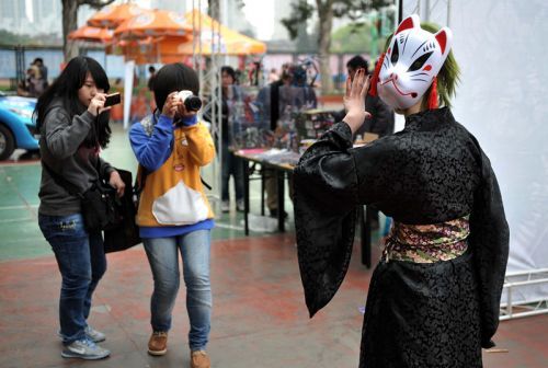 在台下环顾四周,穿着奇形怪状动漫服装或戴着动漫面具的观众随处可见。他们有的扮演《东方project》中的蕾米莉亚;有的戴美瞳、紫色假发,穿洛丽塔裙子,扮演小萝莉,不过这可是个男生,而与他同行的另外两个小男生也是一副女性角色装扮。