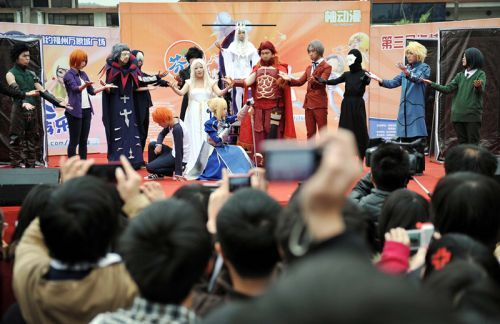 在舞台上,有华丽古装扮相的姑娘在演绎国产漫画《长安幻夜》,也有穿着日本传统服饰的舞者在挥舞着大刀演绎日本动漫《银魂》,还有一支20多人的团队在演绎“Fate”系列动漫。台下的观众看得起劲,越站越靠前。