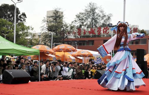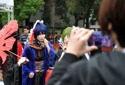 红眼睛的帅气男子、穿着精致古装的妩媚女郎、扛着刀剑的侠士,这群从动漫里走出来的人物,昨日出现在福州大学至诚学院里。这里正在举行2013年“榕城校园动漫文化节”,该文化节为期两天,昨天是活动的第一天,来自福州大学、福建师范大学、福州高级中学等20多个动漫社团或个人聚在一起过节。