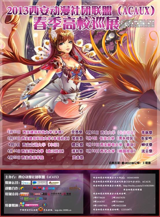 由西安动漫社团联盟主办的2013年西安动漫社团联盟(ACAUX)春季高校巡展,已进入全面启动阶段。