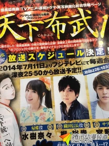 由石井步原作的动漫《信长协奏曲》此前传出过TV动画化的消息。近日,一张偷跑图片曝光了本作品的具体播出档期以及播出机构。由于这部作品是富士电视台成立55周年纪念作品,因此动画将由富士电视台独家播出也就不足为奇了。具体的播出时间为:2014年7月12日凌晨1点50分,此后每周六播出。
