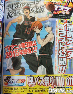 此前已宣布TV动画第3季制作决定的「黑子的篮球」,目前在最新杂志中正式告知将于明年播出,并且还公开了新作的最新插图!在本次公布的插图上,我们可以看到黑子哲也与火神大我分别在展现各自的投篮特殊技巧——“幻影射篮”、“流星之灌篮”。