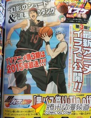 超人气运动题材漫画《黑子的篮球》可以说是最近几年来最为成功的体育类动漫作品之一。不但漫画人气一路走高,相关同人活动有序进行,就连动画也在此前确定将制作第三季,这种动画化的速度恐怕能够让不少作品的粉丝恨得咬牙切齿吧。而近日,根据一张杂志偷跑情报,第三季的动画作品确定将在2015年正式与观众们见面。