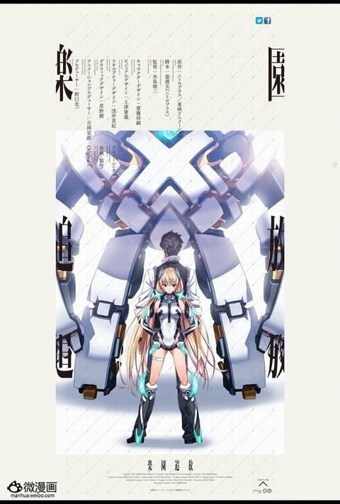 另外本作最新视觉概念画也在杂志和官网中公开,在白色的巨大机器人面前,身穿暴露战斗服装的少女和看起来略年长的男性背背相靠,看起来本作将是继《翠星之加尔冈蒂亚》之后又一部虚渊玄担任脚本的机器人动画。目前作品故事细节不明。