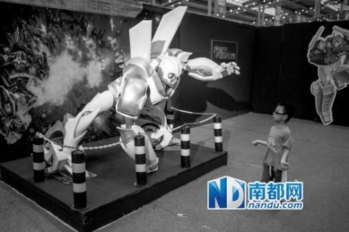 →在变形金刚展馆内,一名小朋友看到变形金刚雕塑显得十分兴奋。