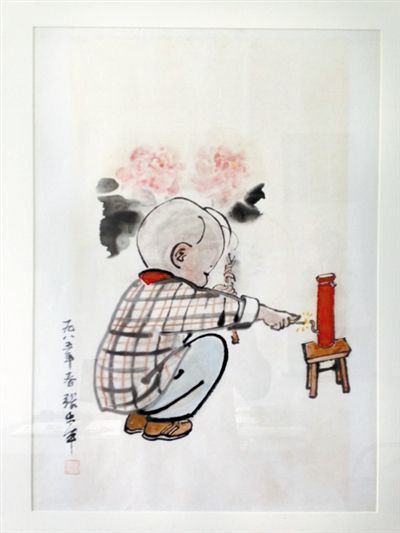 第一幅漫画(左图)略带国画风格,在这幅漫画中,三毛已不再是流浪、从军时衣衫褴褛的形象,而是一名系着红领巾的少先队员,穿着红黑相间格子上衣、蓝色裤子,标志性的三缕头发仍垂在额前。画面上的三毛蹲在地上,一手握着两枝盛放的粉红色牡丹,一手拿着一根已点燃的火柴,小心翼翼地凑近爆竹的引线,一副俏皮模样。
