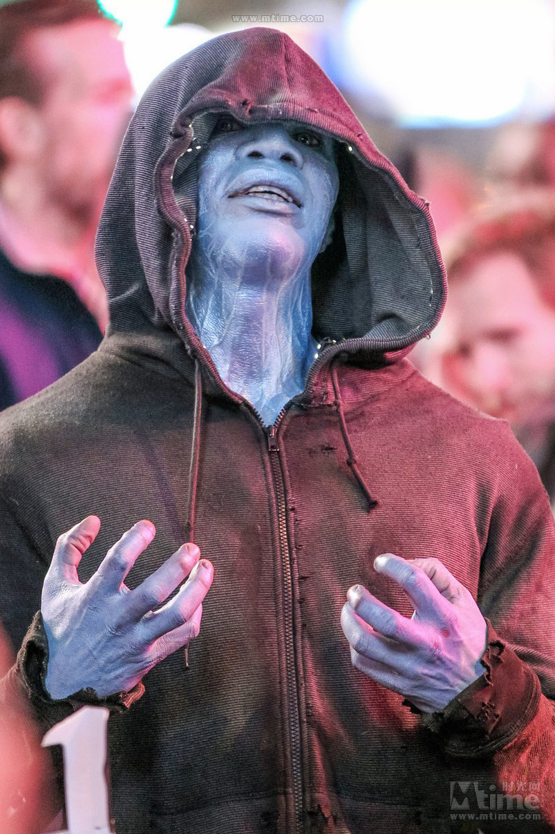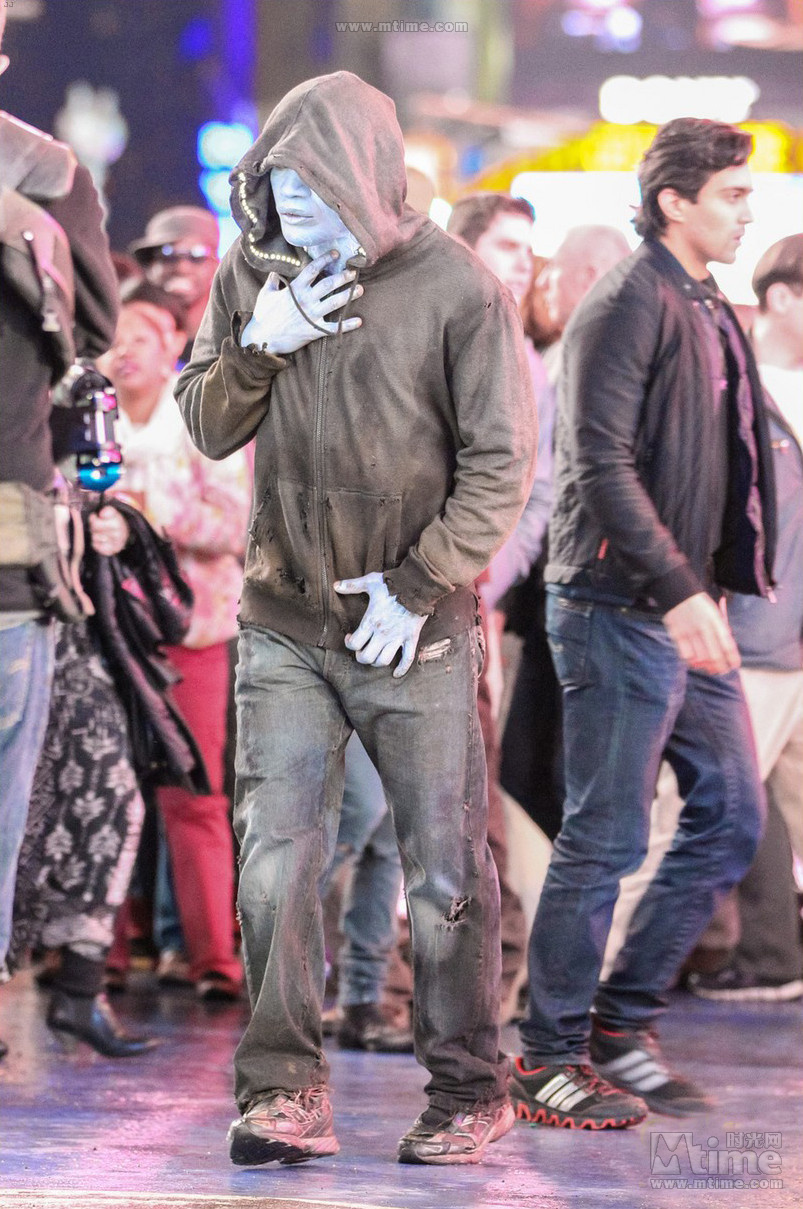 当地时间4月15日,由马克·韦布执导、安德鲁·加菲尔德、艾玛·斯通和谢琳·伍德蕾主演的超级英雄电影《超凡蜘蛛侠2》正在美国纽约热拍,当日片场迎来了令我们期盼已久的大反派:刚刚在《被解放的姜戈》中献出精彩表演的黑人奥斯卡影帝杰米·福克斯出演的“电光人”出现在纽约时代广场,身穿套头衫混迹于人群之中,半透明的皮肤下青筋暴露,面泛蓝光表情狰狞,似乎是在寻找着什么。