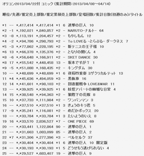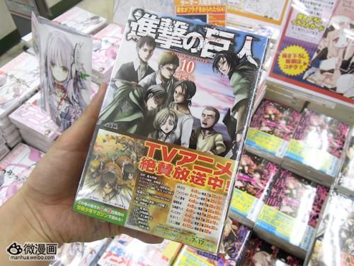 TV动画《进击的巨人》于4月开播,同时由諫山创执笔的原作漫画第10卷也在4月9日发售。现在据最新发表的Oricon周销量榜,漫画第10卷首周销量为41.7万本,排名周榜漫画部门第1名。