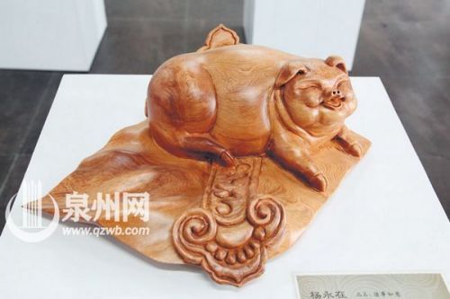 在展台一角,记者看到一幅名为《蜕变》的作品,通过凿空木雕内部,表示残躯的立意,但在圆弧、优雅的曲线中,却能让人感觉能量的重新聚集,暗含人生充满希望,表达了“物极必反、蜕故孳新”的哲理。据了解,《蜕变》的市场价格在38万元左右。另一幅《诸事如意》,则以猪为造型,寓意又十分吉祥,价格约16万元。