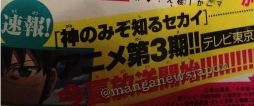 据悉,改编自若木民喜人气漫画的TV动画《只有神知道的世界》第三期将于7月在东京电视台开播。漫画《只有神知道的世界》描写擅长GALGAME游戏的攻略之神桂木桂马,偶然间与从地狱来的驱魂恶魔少女艾露西相遇,开始了攻略现实中女生来协助驱魂的故事。