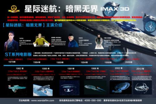 为了让“星际迷”们感受到这部系列电影的怀旧氛围,也为了带领更多观众了解和回顾从1979年开始到2013年间12部“星际迷航”系列电影的人物关系和历史轨迹,北京万达影城特制作了大型专题“导航”在各店进行展示。当然,对于初次接触《星际迷航》系列的观众,这块万达影城独有的“星际导航”看板将为大家提供观影前必备的准备功课方便大家更清晰的把握电影脉络,享受影片带来的视觉冲击。