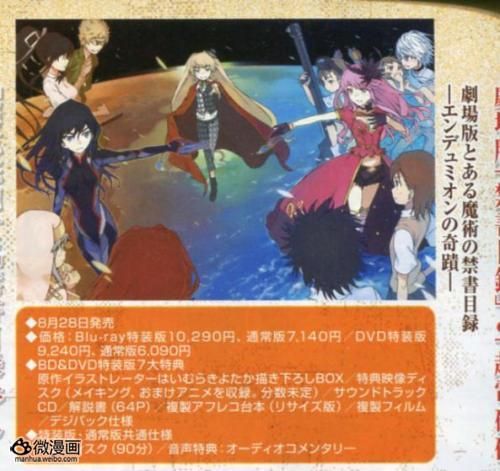 另外剧场版《魔法禁书目录 恩底弥翁的奇迹》的BD/DVD也确认将于8月28日发售。BD特装版定价10,290日元,附送OST CD、解说书、复制台本、复制胶片、评论音轨和片花映像。