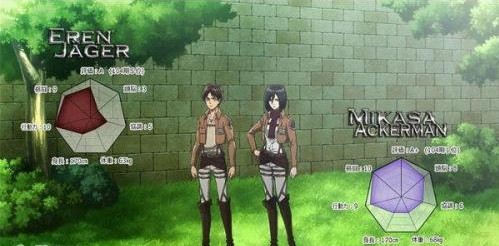 另外《进击的巨人》动画已经播出到第8话,现在官方给出了第104期练兵团毕业生们的能力表,图标中按逆时针方向依次是评价、格斗、行动力、身高、体重、协调、头脑指标,可以清晰的看到每个人之间的能力特色和差距。