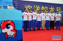 6月25日,身穿印有“蛟龙”号卡通形象“龙龙”T恤的3名潜航员唐嘉陵(右一)、叶聪(右二)、付文韬(右三)与工作人员在起航仪式上合影。当日,中国船舶重工集团在“蛟龙”号前往西北太平洋执行2014—2015年“蛟龙”号载人潜水器试验性应用航次的起航仪式上,正式发布了“蛟龙”号载人潜...